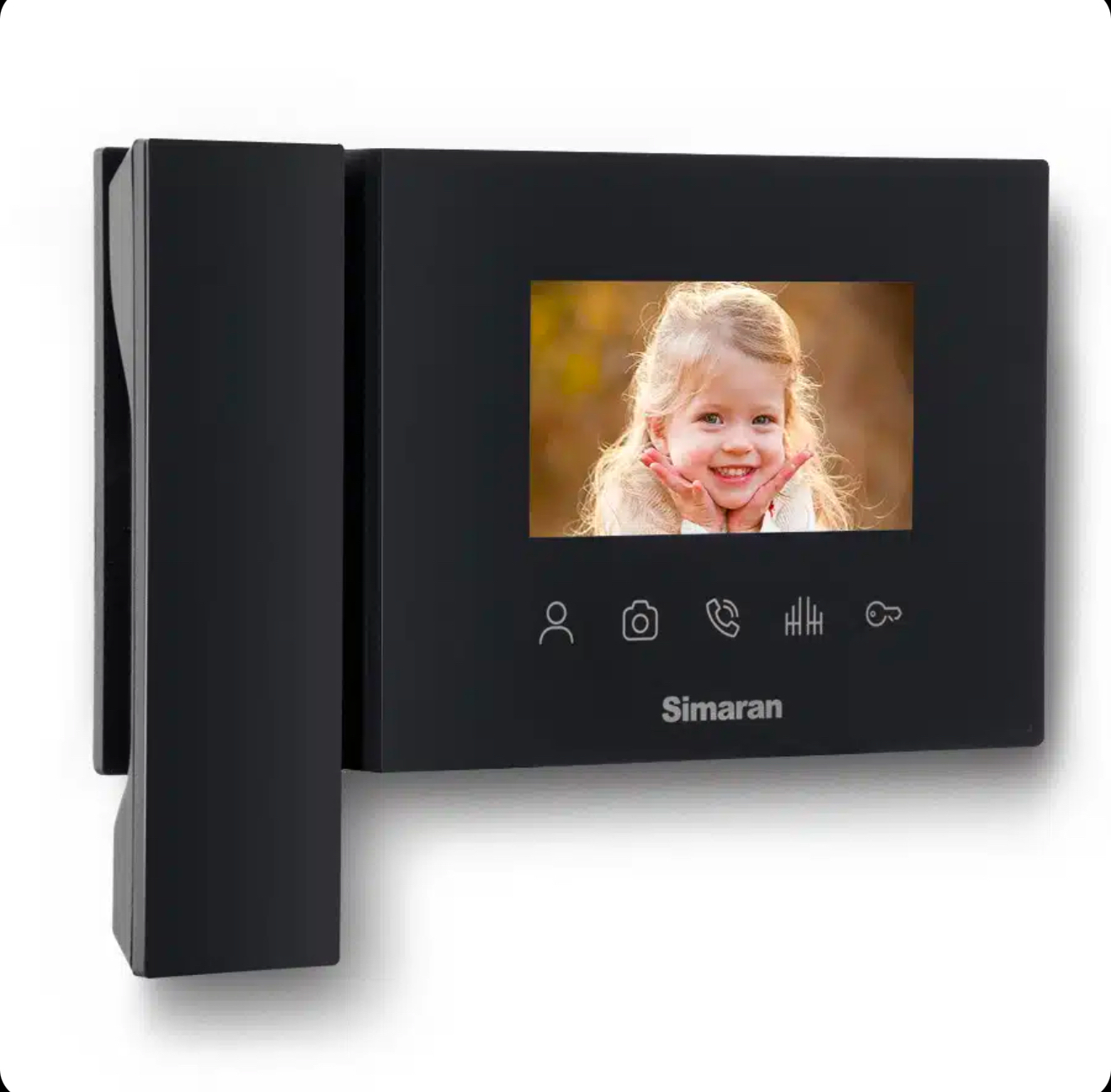 در سمت چپ این مانیتور از گوشی مگنت دار با طراحی جدید استفاده شده و در وسط صفحه نمایشگر 4.3 اینچ به چشم می خورد ، استفاده از کلید های لمسی ( TOUCH KEY ) و LED های آبی، زیبایی محصول را دوچندان کرده است، در قسمت پایینی(زیر) مانیتور کلید خاموش و روشن کردن مانیتور تعبیه شده است.